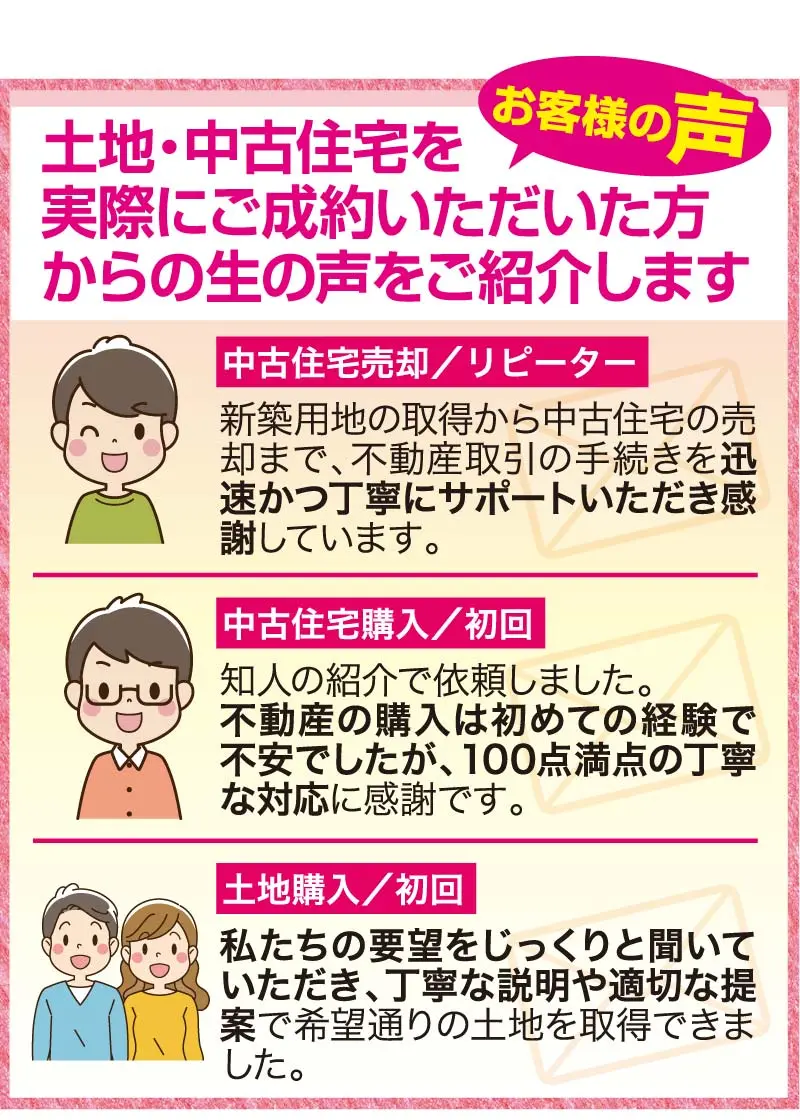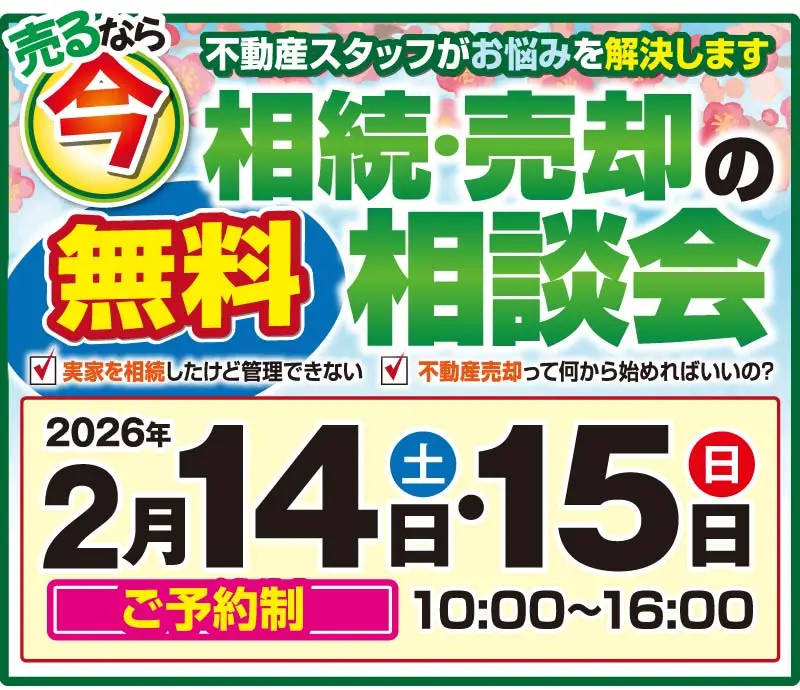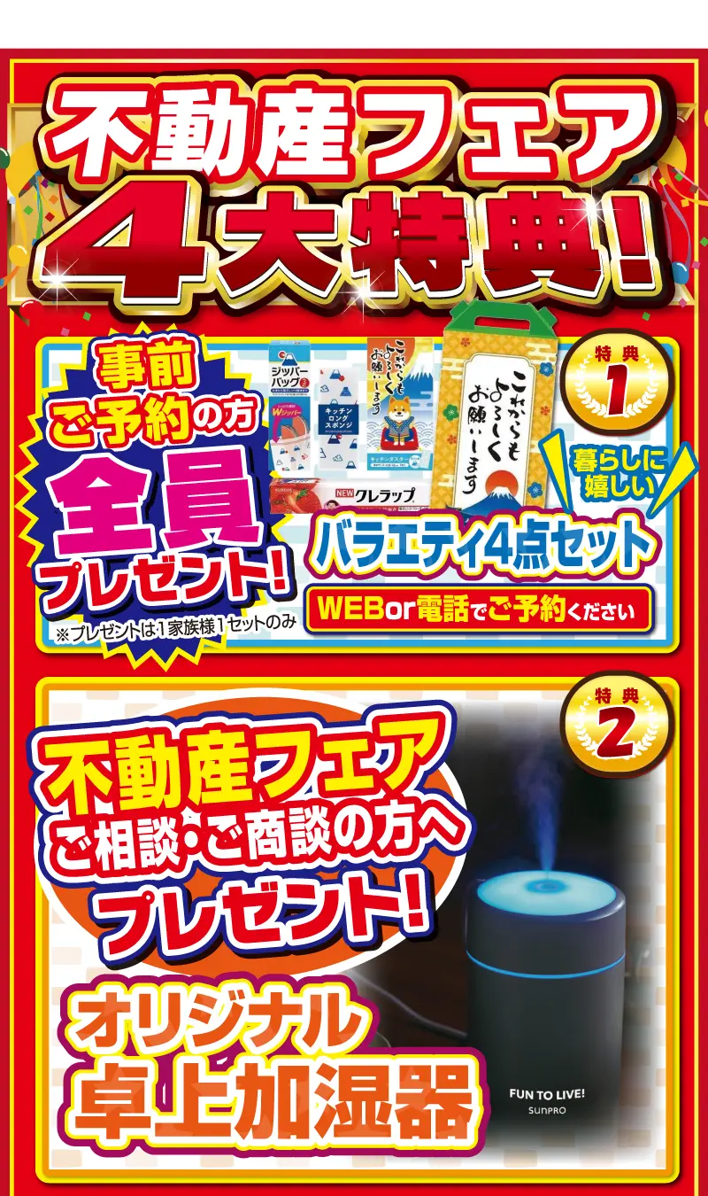 必須 ご来場希望日時 --- 必須 ご相談内容(複数選択可) 土地・中古住宅さがし土地・中古住宅の売却相続・贈与の相談分譲住宅の購入新築・中古リノベを検討中資金・住宅ローンについて聞きたい今後の家づくりのために情報収集その他 任意 無料相談会(予約制) 希望する希望しない 必須 お名前 必須 ふりがな 必須 郵便番号 必須 ご住所 必須 メールアドレス 必須 電話番号 差支えなければ、以下の質問にもお答えください。 任意 お取引希望時期について 時期検討中・これから検討すぐにでも1ケ月以内1ケ月~半年以内半年~1年以内1年~2年以内2年~3年以内3年以上先 任意 このイベントを知ったきっかけ InstagramLINEfacebookホームページWEB検索バナー広告新聞折込チラシポスト投函チラシご紹介その他 任意 ご質問、ご要望など 【自動メールが届かない場合】 お申し込み後、すぐに確認メールが自動送信されます。 届かない場合、迷惑メール設定によりブロックされている可能性があります。 特に docomo・au/ezweb・softbank の方は設定をご確認ください。 ご不明点などございましたら、お電話でもお気軽にお問合せください。0120-363322 このまま進むことで、当社の個人情報取扱方針にご同意いただいたものとしてお手続きを承ります。 内容をご確認のうえ、よろしければボタンを押してお進みください。 ありがとうございます。メッセージは送信されました。 15分以内に確認用の自動返信メールが届きます。 メールが届かない場合は、メールアドレスが誤っているか、確認メールが迷惑メールフォルダ等に振り分けられている、ドメイン指定で拒否されている可能性がありますので、再度ご確認をお願いいたします。 また、ご使用の端末/メールシステムの空き容量不足により、メールを受信できない場合もございます。その際は空き容量の確保をお願いいたします。 よろしくお願いいたします。 閉じる
